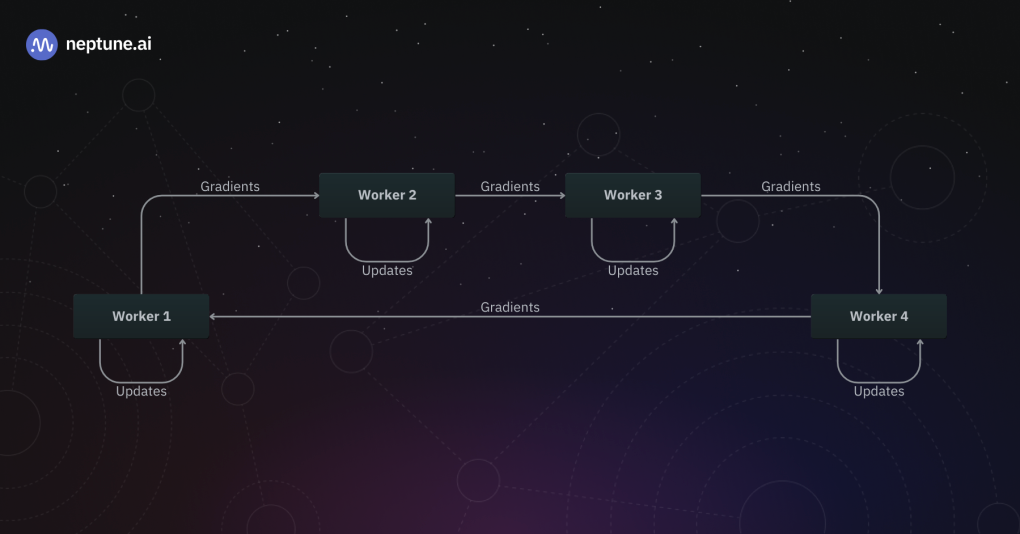 - これは、あるワーカーからリングの次のワーカーに勾配の合計を渡し、次のワーカーは自分の計算した勾配を合計に加え、次のワーカーに渡すことで実現されます。このプロセスは、すべてのワーカーがリング内のすべてのワーカーから集めた勾配の完全な合計を持つまで繰り返されます。