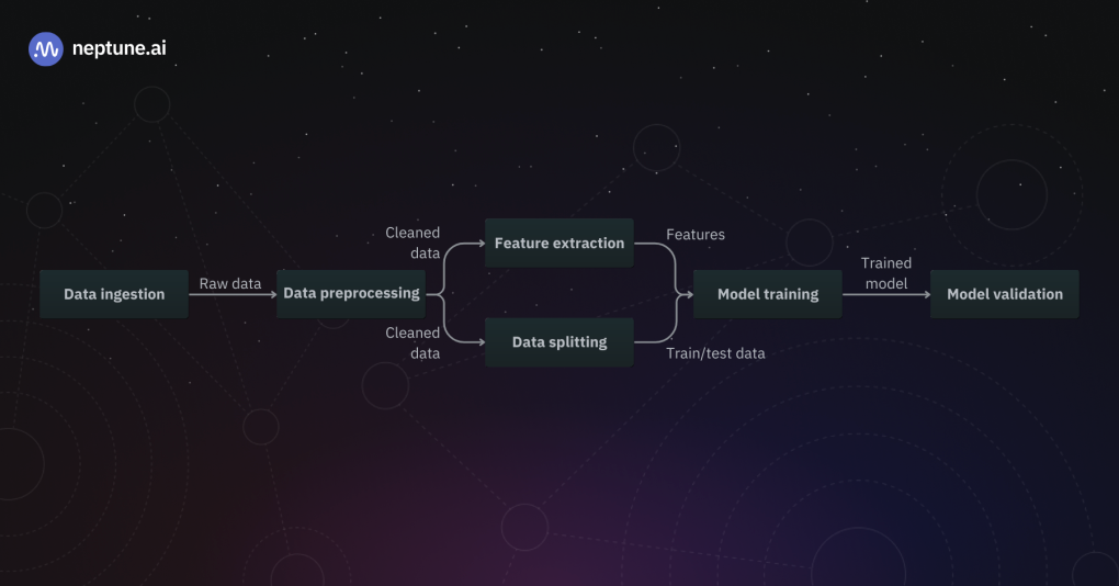 - 例えば、上の図は、データの取り込み、前処理、特徴抽出、モデルのトレーニング、モデルの検証、予測を含む標準的なMLパイプラインを示す
