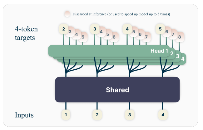 - multi-token prediction では、学習時は shared trunk と複数のheadを用いて、同時に複数のトークンを予測する