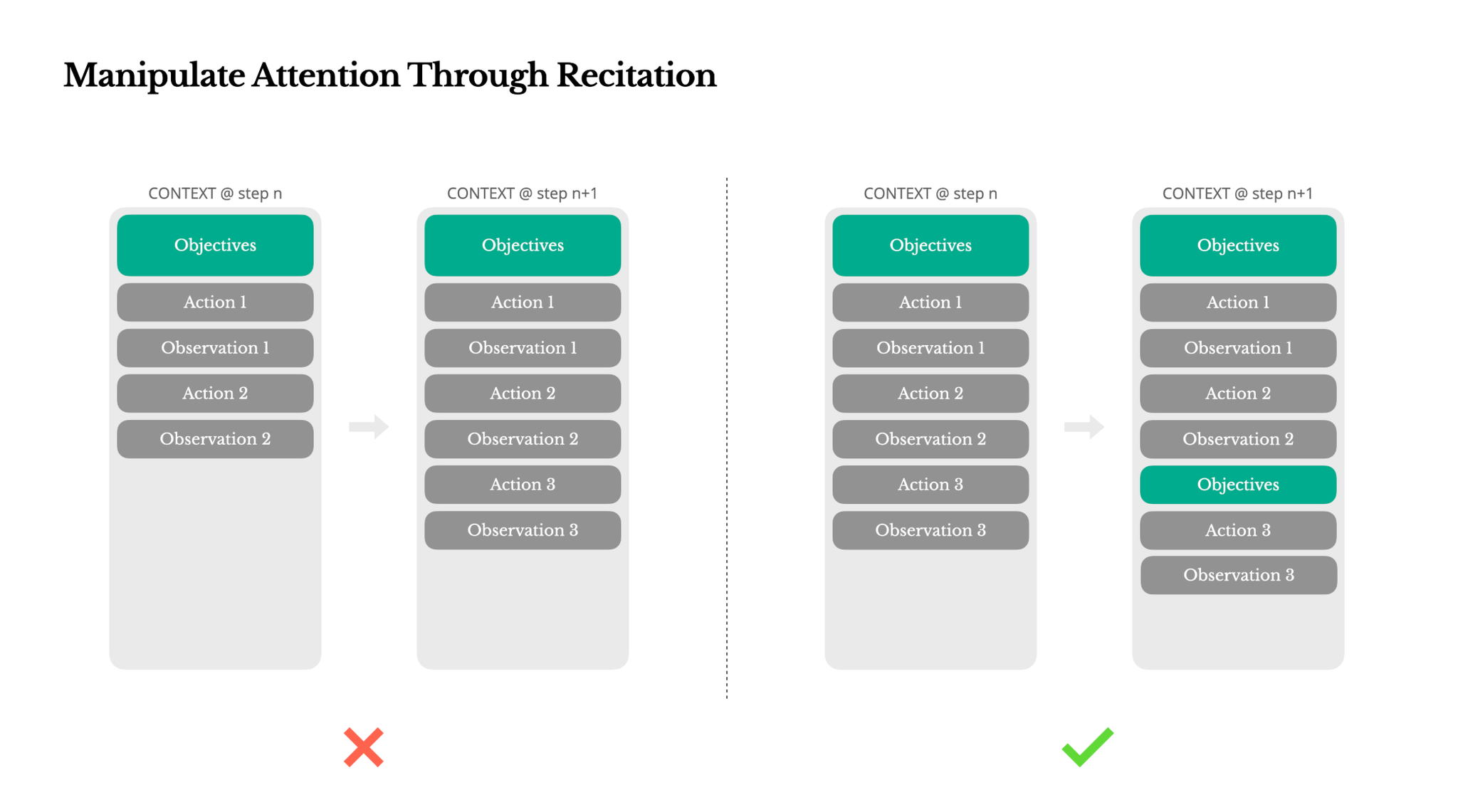 Manusにおける典型的なタスクは、平均で約50回のツール呼び出しを必要とします。これは長いループであり、Manusは意思決定のためにLLMに依存しているため、特に長いコンテキストや複雑なタスクでは、話題から外れたり、以前の目標を忘れたりする脆弱性があります。todoリストを継続的に書き換えることで、Manusは目標をコンテキストの末尾に繰り返し記述しています。これにより、全体的な計画がモデルの最近のアテンション範囲に押し込まれ、「中途半端に失われた(lost-in-the-middle)」問題を回避し、目標の不整合を減らします。実質的に、特別なアーキテクチャの変更を必要とせずに、自然言語を使用して自身の焦点をタスク目標に偏らせているのです。