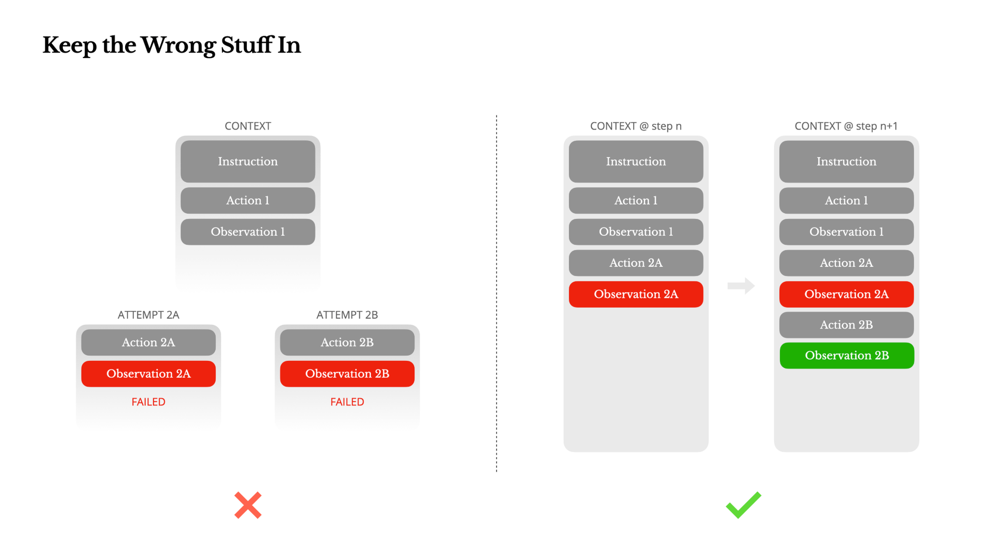 エージェントは間違いを犯します。これはバグではなく、現実です。言語モデルは幻覚を起こし、環境はエラーを返し、外部ツールは誤動作し、予期せぬエッジケースが常に発生します。複数ステップのタスクでは、失敗は例外ではなく、ループの一部です。それにもかかわらず、これらのエラーを隠そうとするのが一般的な衝動です。トレースをクリーンアップし、アクションを再試行し、モデルの状態をリセットして「温度」に任せる、といったことです。それはより安全で、より制御されているように感じられますが、コストがかかります。失敗を消去することは証拠を消去することです。そして、証拠がなければモデルは適応できません。