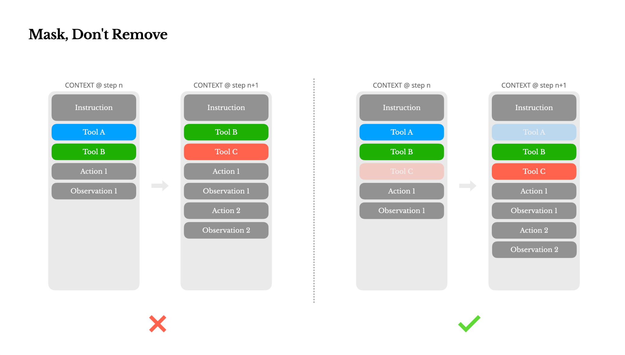 1. ほとんどのLLMでは、ツール定義はシリアライゼーション後、コンテキストの先頭付近(通常はシステムプロンプトの前または後)に配置されるため、変更があるとそれ以降のすべてのアクションと観測のKV-キャッシュが無効になります。