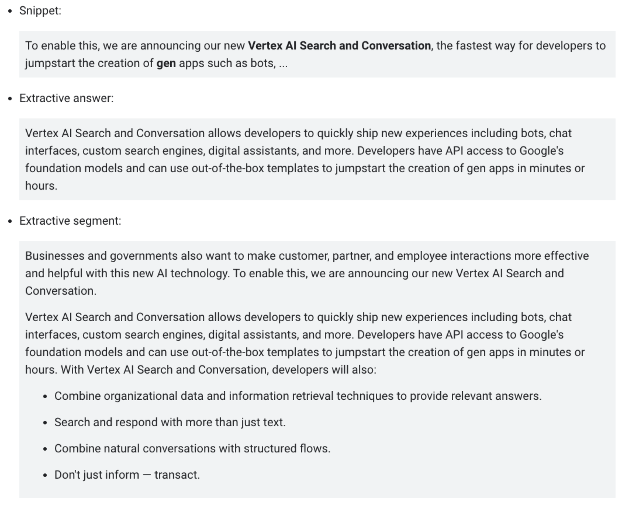 - Vertex AI Searchには検索結果のSummaryを生成する機能やフォローアップの質問を行う機能がデフォルトである。
