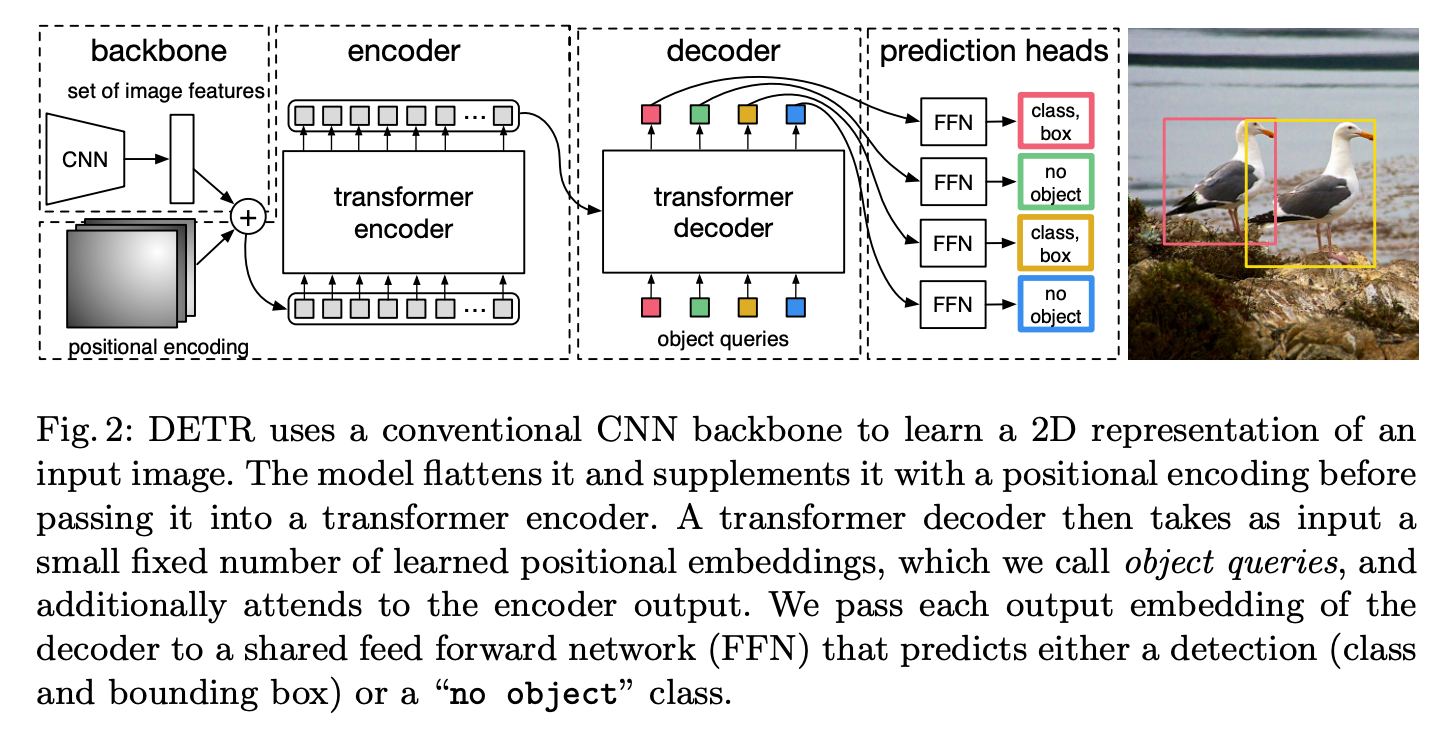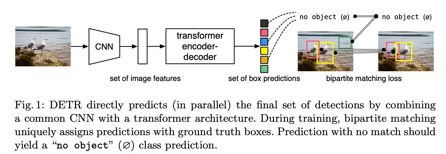 - Fast(er)-RCNNは複数の構成要素があるが、DETR (DEtection TRansformer) はtransformerの枠組みを使ってe2eで学習・予測できるようにした最初の論文