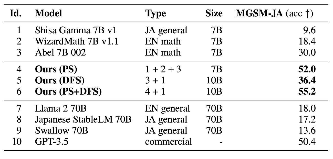 - 日本語の言語モデル(Shisa Gamma 7B v1)と、数学に特化した英語の言語モデル(WizardMath 7B v1.1, Abel 7B 002)をマージ