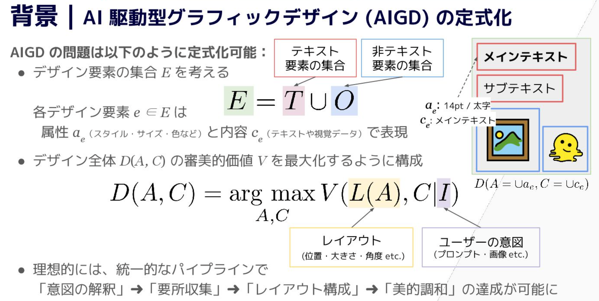 AI駆動型グラフィックデザインの技術調査論文に対するまとめ。基本的なところから解説してあり、ありがたい。