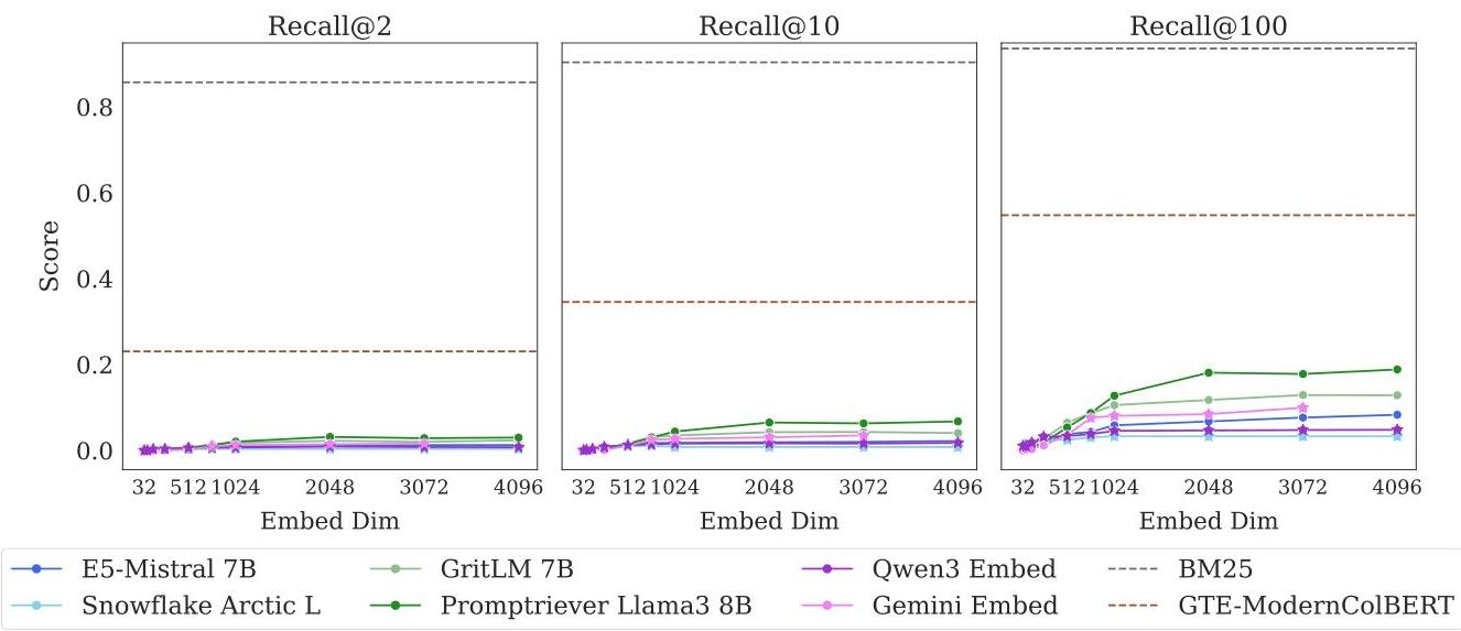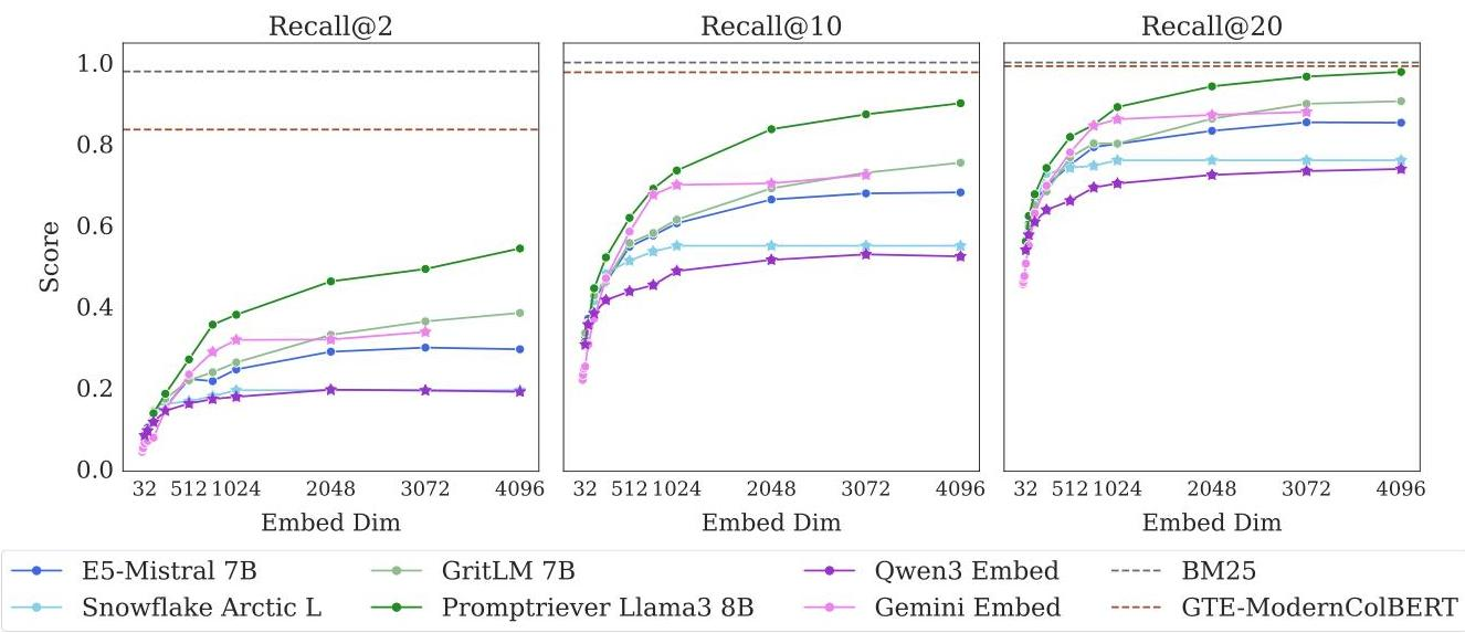 - BM25のような古典的なキーワード検索モデルや、ColBERTのようなマルチベクトルモデルは、単一ベクトルの埋め込みモデルよりはるかに良い性能