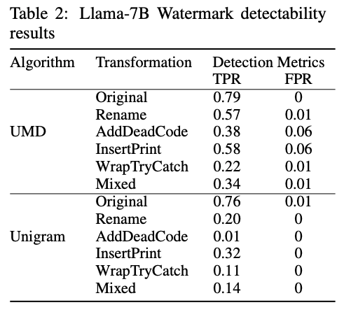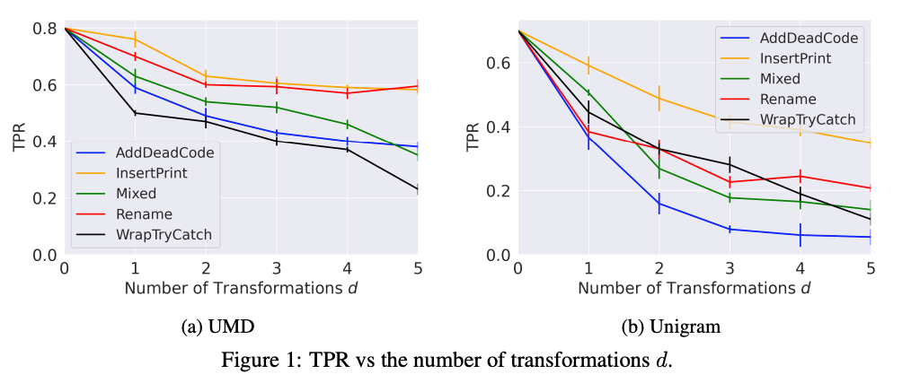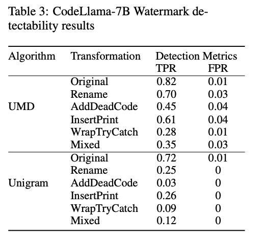 - HumanEvalデータセットでコードの生成を行い、LLM製コードが変換のちに検知できるかをTPR, FPRの観点で調査
