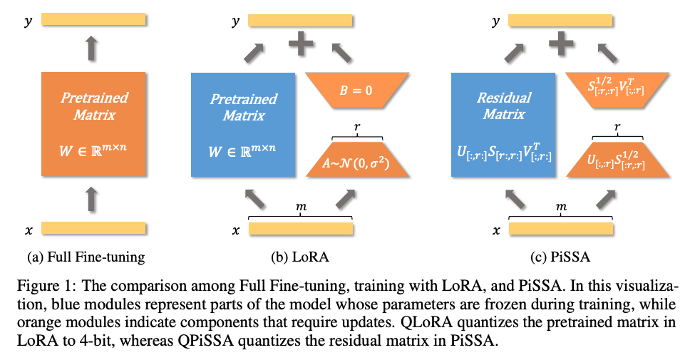 arXiv.orgPiSSA: Principal Singular Values and Singular Vectors Adaptation... - 重み行列に特異値分解を適用し、「主要な低ランク行列」と「残差行列」に分解し、その結果と特異ベクトルを使ってA, Bを初期化