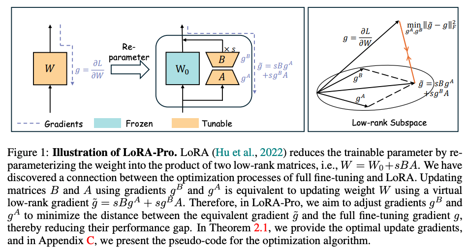 - LoRAのA, Bに対する勾配(の組み合わせ)が、フルファインチューニングにおける真の勾配に近づくよう調整しながら学習する
