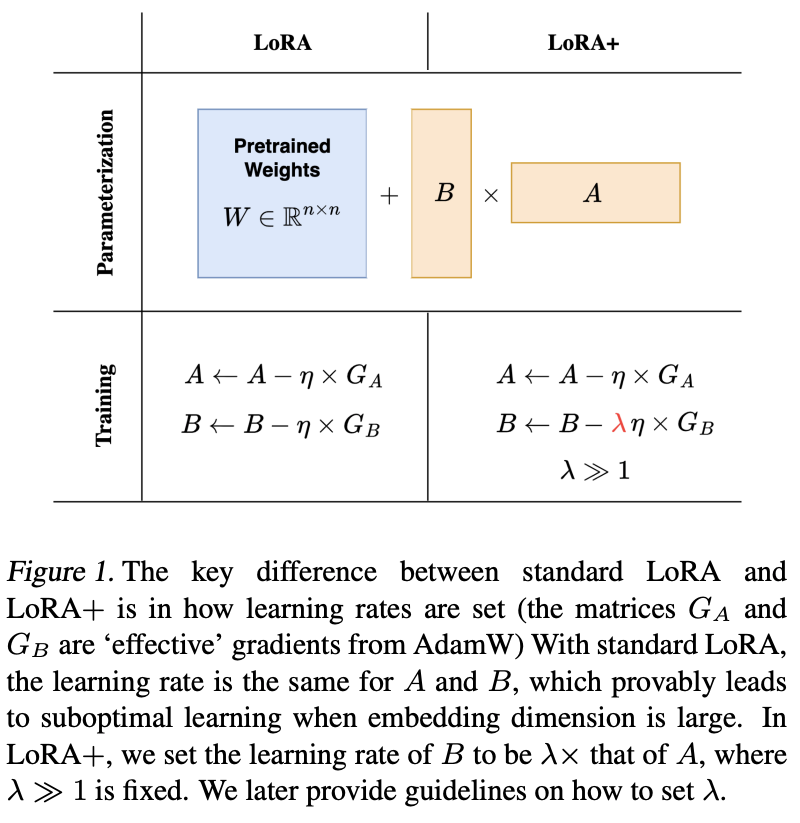 arXiv.orgLoRA+: Efficient Low Rank Adaptation of Large Models - アダプター行列AとBに、それぞれ異なる学習率を適用させて、収束速度と最終的な性能を改善