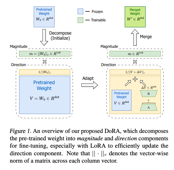 arXiv.orgDoRA: Weight-Decomposed Low-Rank Adaptation - 学習済みの元の重みをマグニチュード m と方向行列 v に分解し、方向成分だけLoRAで学習。