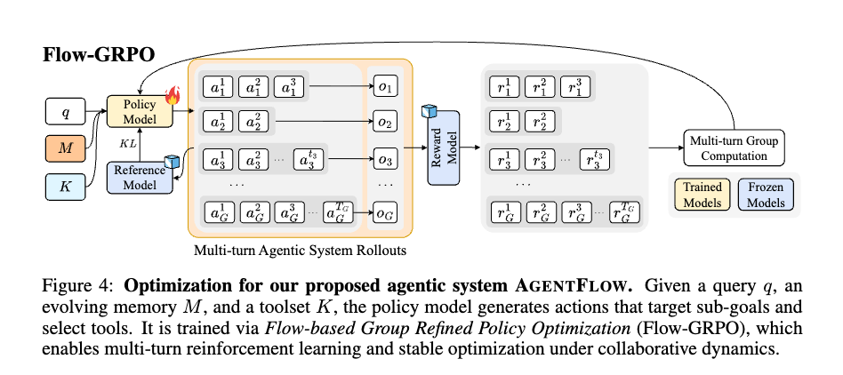 - 長期にわたる、報酬が疎な設定下で安定したオンポリシー学習を可能にするために、FlowGRPOを導入した。これは、単一の検証可能な軌道レベルの結果をすべてのターンにブロードキャストし、グループ正規化されたアドバンテージでクレジット割り当てを安定させることによって、複数ターンのRLを扱いやすい単一ターンのポリシー更新のシーケンスに変換する。