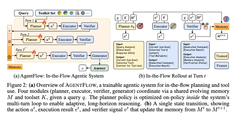 - 進化するメモリを介して4つの専門化されたモジュールを調整し、複数ターンのループ内でプランナーを直接最適化する、訓練可能なインザフローのエージェントシステムであるAGENTFLOWを提案した。