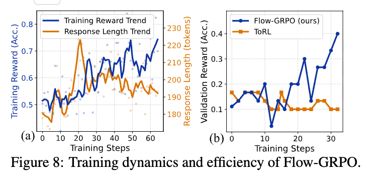 - 訓練報酬は着実に増加しており、Flow-GRPOによる効果的なポリシー改善を示している。 一方、応答長は、初期の探索的な上昇の後、徐々に短くなり安定する。