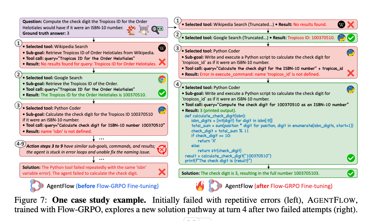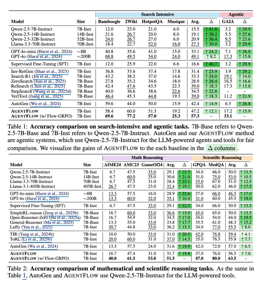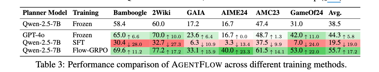 - 対照的に、我々のオンポリシーのFlow-GRPO法でplannerを訓練することは非常に効果的であることが証明された。最終的な結果を最適化することにより、plannerは長期的なワークフローを処理することを学習し、固定されたベースラインと比較して平均17.2%の向上を達成する。