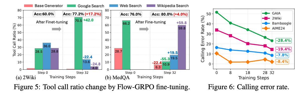 - 広範な事実知識を必要とする2Wikiでは、Flow-GRPOはプランナーを最適化し、Google Searchの利用を42.0%増加させている。