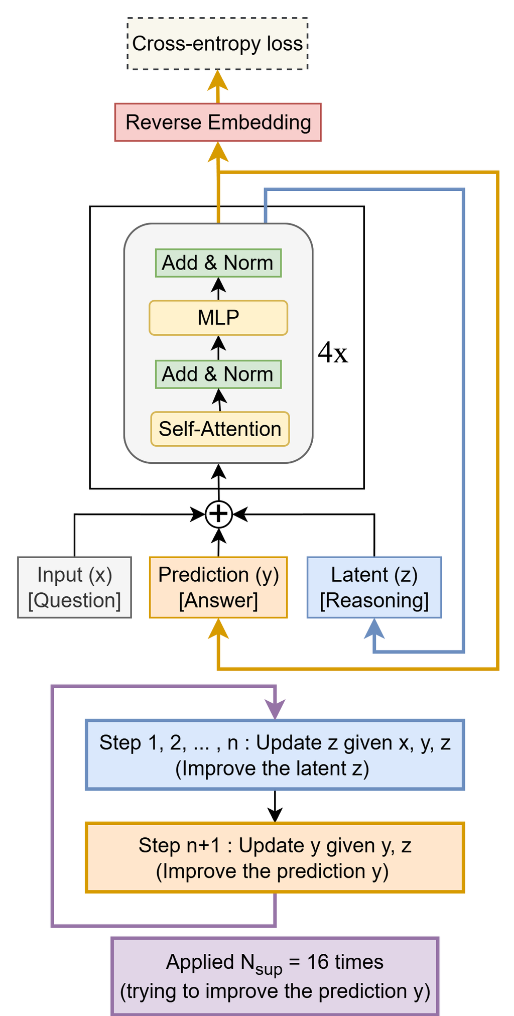 - Latent (z): 問題の文脈と推論チェーンを維持する推論特徴