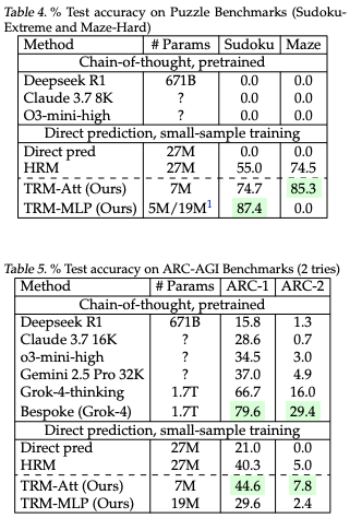 - わずか7MパラメータのTiny Recursive Model(TRM)によって、複雑な推論タスクにおいて、より大規模な特殊モデルと最先端のLarge Language Models(LLM)の両方を大幅に上回る性能を発揮。