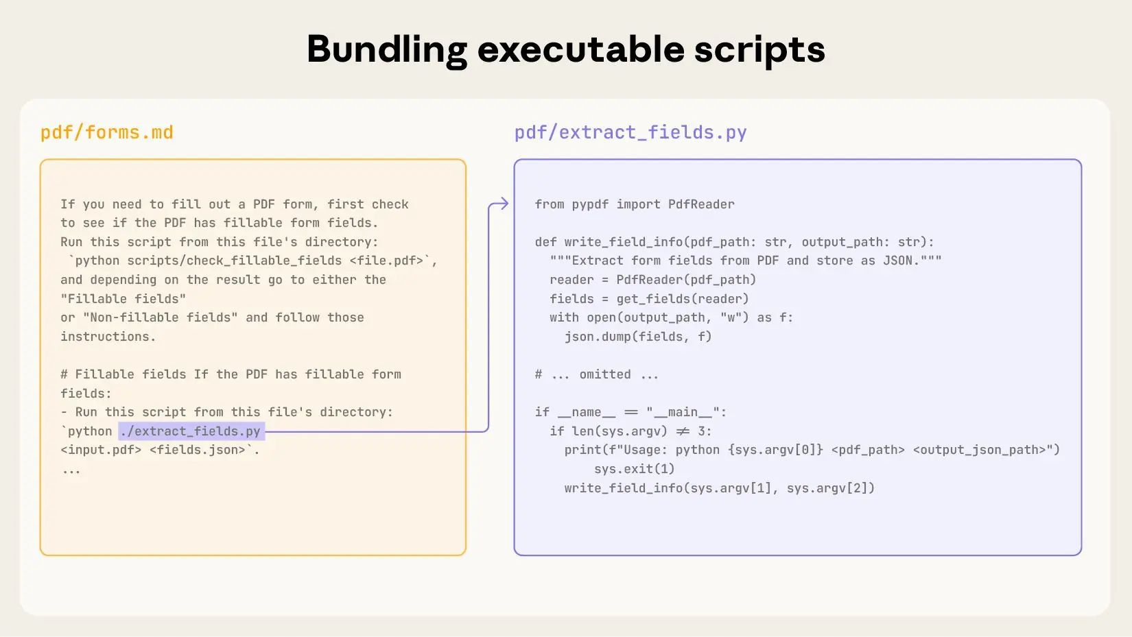 スキルごとに用意される (PDF処理に関するものは など)にはyamlフォーマットで name と description が定義される。このスキルをいつ実行すべきかを判断するための情報をここに含める。Agent は起動時にこの name と description しか読まない。なのでコンテキストが大きく節約される。