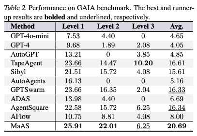 - 特に、多様なドメインのタスクを含むGAIAベンチマークにおいて、MaASはクエリに応じて適応的にシステムをサンプリングできるため、他の手法が性能向上に苦戦する中で、大幅な改善(Level 1で18.38%、Level 2で17.61%)を達成