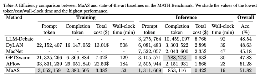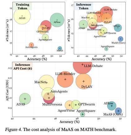 - 推論コスト: MaASは最高の精度を達成しながら、推論時のAPIコストは0.42ドルと非常に低コスト。クエリの難易度に応じて動的にリソースを割り当てるAgentic Supernetの能力によるもの