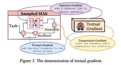 - サンプリングされたMASがクエリを実行し、その結果(フィードバック)が悪かった場合に、勾配エージェントが「どうすればこのオペレータはもっと良くなるか」を分析し、以下の3種類の「勾配」をテキストで出力