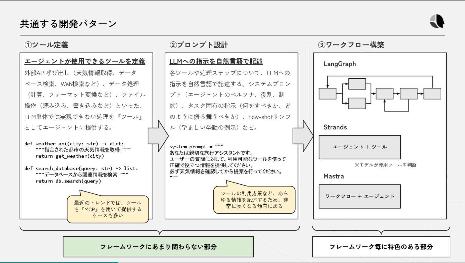 - どんなフレームワークを使おうとツール定義やプロンプト設計は変わらない