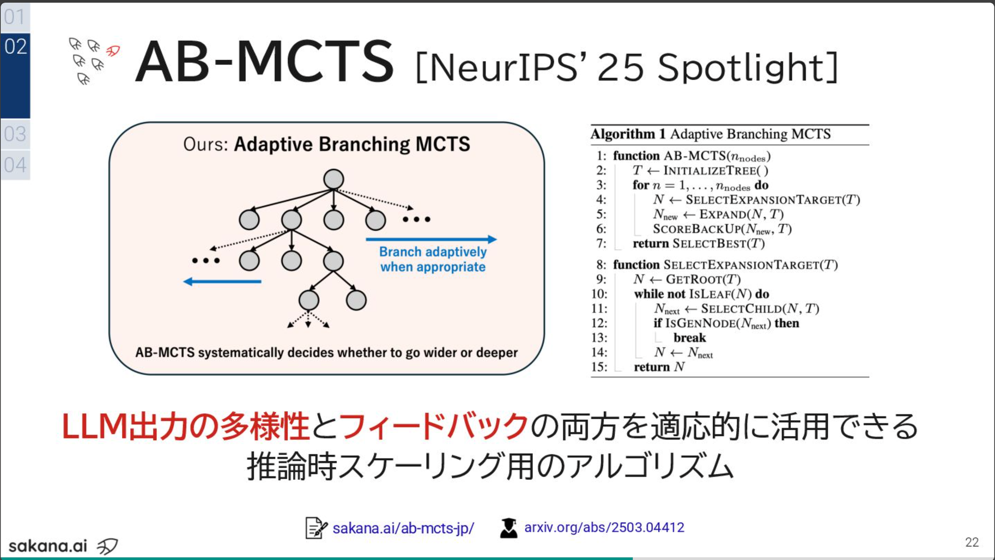 - Go wide (Repeated Sampling) とGo deep (Sequential Refinement) を組み合わせたAB-MCTS