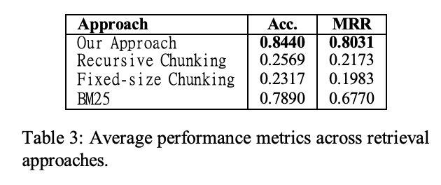 - 提案手法は Accuracy 0.8440、MRR 0.8031 を達成し、再帰チャンク分割(Accuracy 0.2569、MRR 0.2173)、固定長チャンク分割(Accuracy 0.2317、MRR 0.1983)を大きく上回った