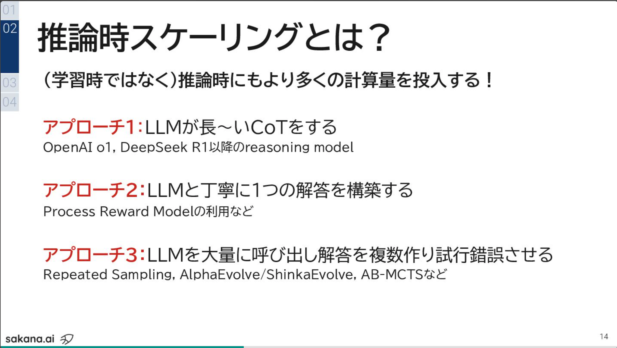 - 学習時だけでなく、推論時に計算量を投入する