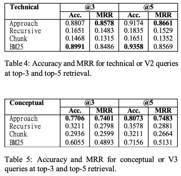 - Table4, 5: さらに、クエリの性質に基づく二つの側面(技術的/概念的)での詳細評価