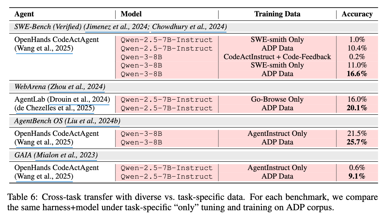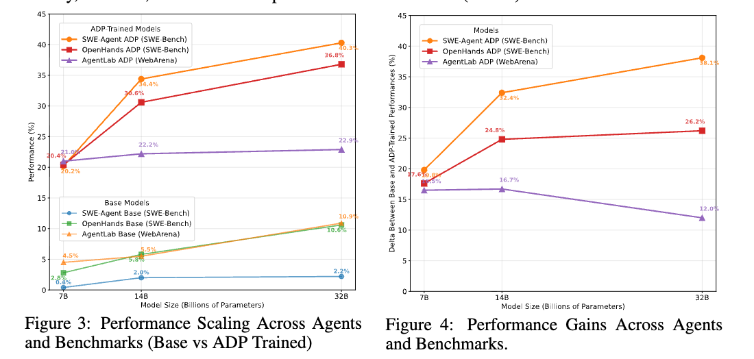 - ADP を使用してエージェントをトレーニングすると、コーディング(SWE-Bench Verified)、ウェブブラウジング(WebArena)、研究(GAIA)、およびエージェントのツール使用(AgentBench)を含む、多様なドメインでパフォーマンスが大幅に向上することが示されている