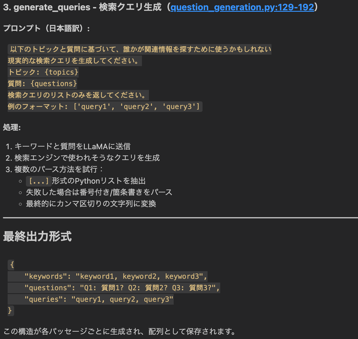 - クエリ生成:生成した質問と抽出したキーワードから、各論文に紐づく複数の検索クエリを構築する。