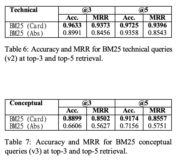 - BM25は技術的クエリでは高精度ですが、概念的クエリでは性能と安定性が大きく落ちます。これに対し、paper-cardを併用するとBM25の精度とMRRが大幅に改善し、両クエリ種で安定性も高まりました。