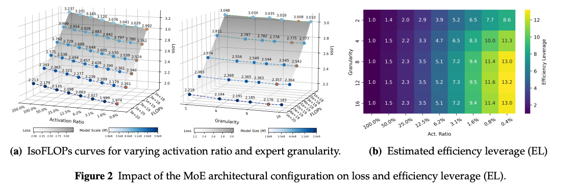 - Efficiency Leverages (EL) = Denseモデルが必要とするFLOPs(計算量) ÷ MoEモデルが必要とするFLOPs を指標として、様々な設定で実験的に検証