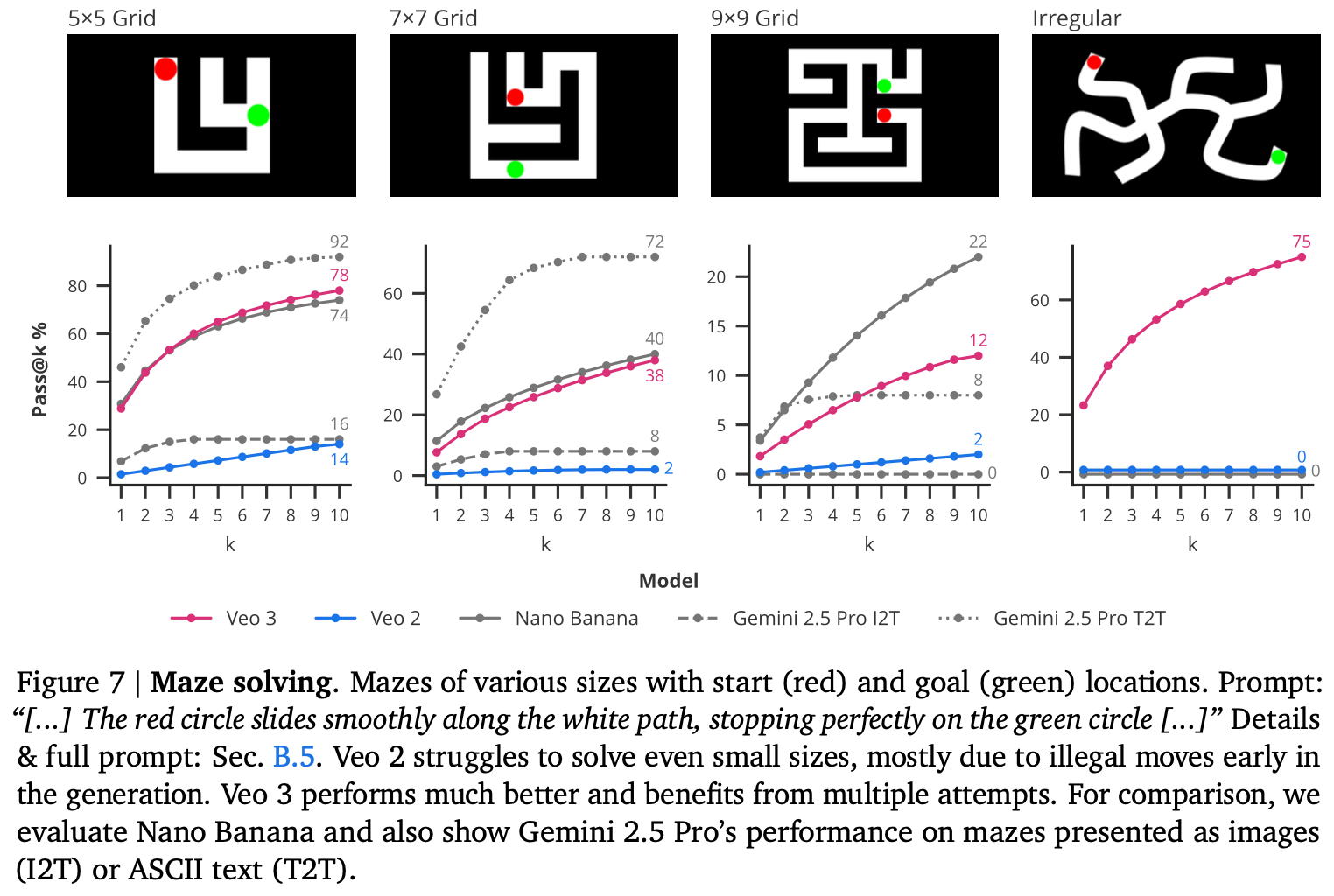 Vertexのドキュメントによると、APIはLLMベースのプロンプトリライターを使用しているため、一部のタスクではLLMからソリューションが来ている可能性が高いが(例:数独)、本研究ではこのシステム全体を単一のブラックボックスエンティティとして扱う。ただし、スタンドアロンのLLM(Gemini 2.5 Pro)が、入力画像のみから主要なタスク(例:ロボットナビゲーション、迷路解決、視覚的対称性)を解決できないことを確認し、ビデオモデルの推論能力を分離した。