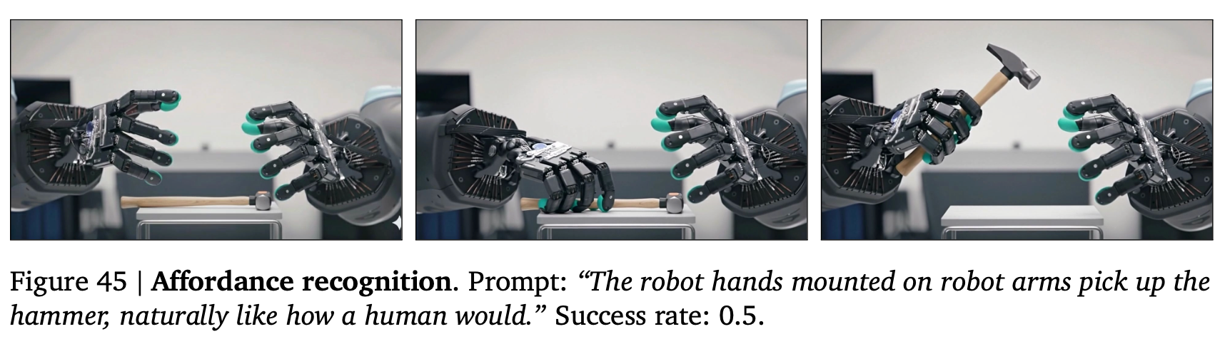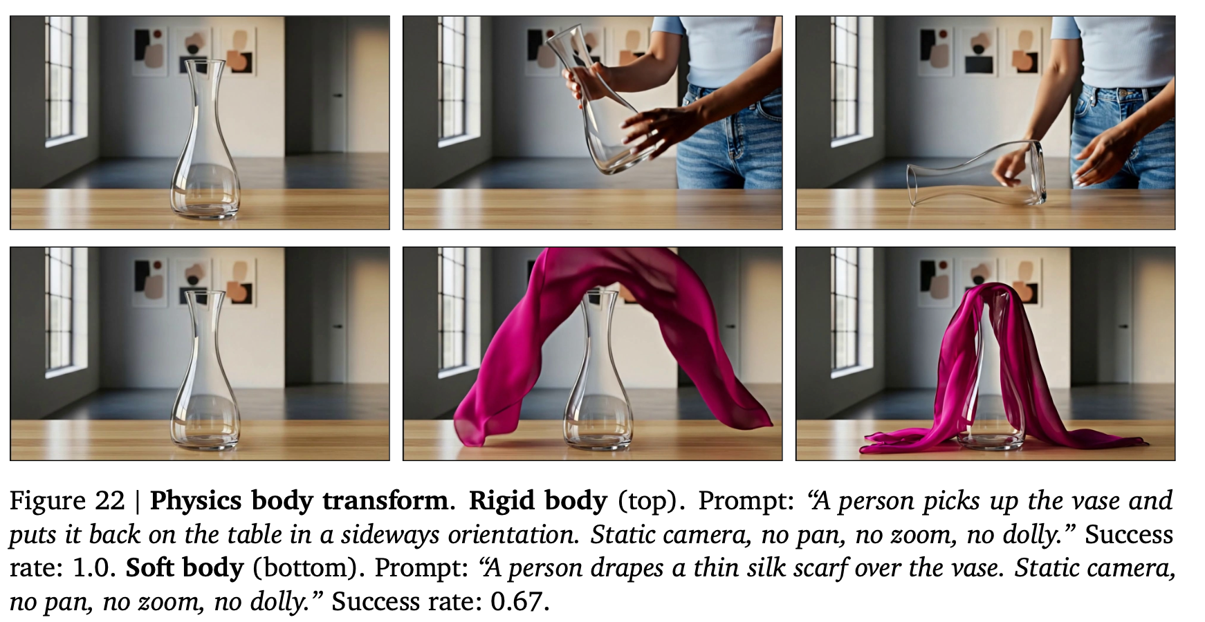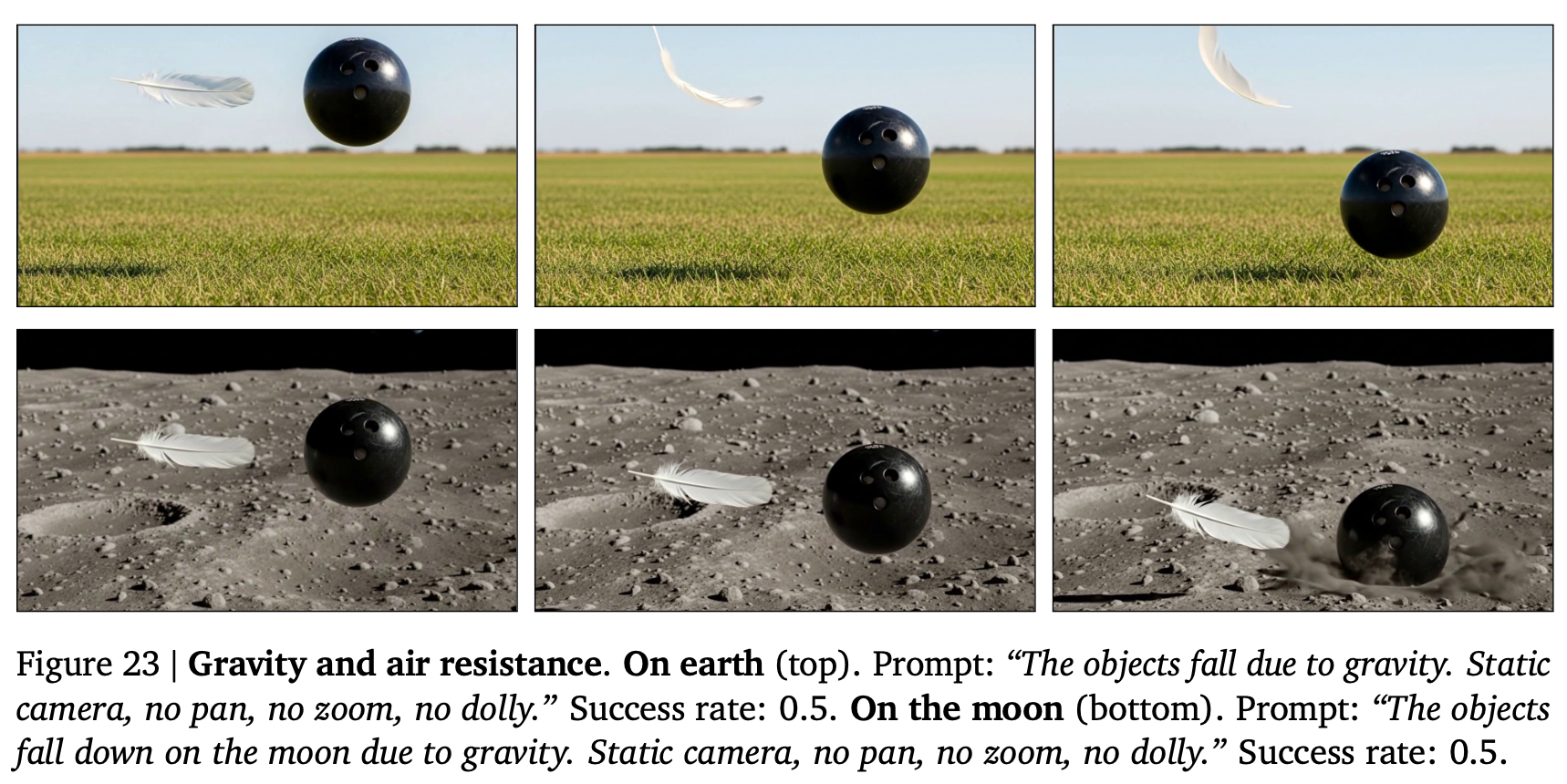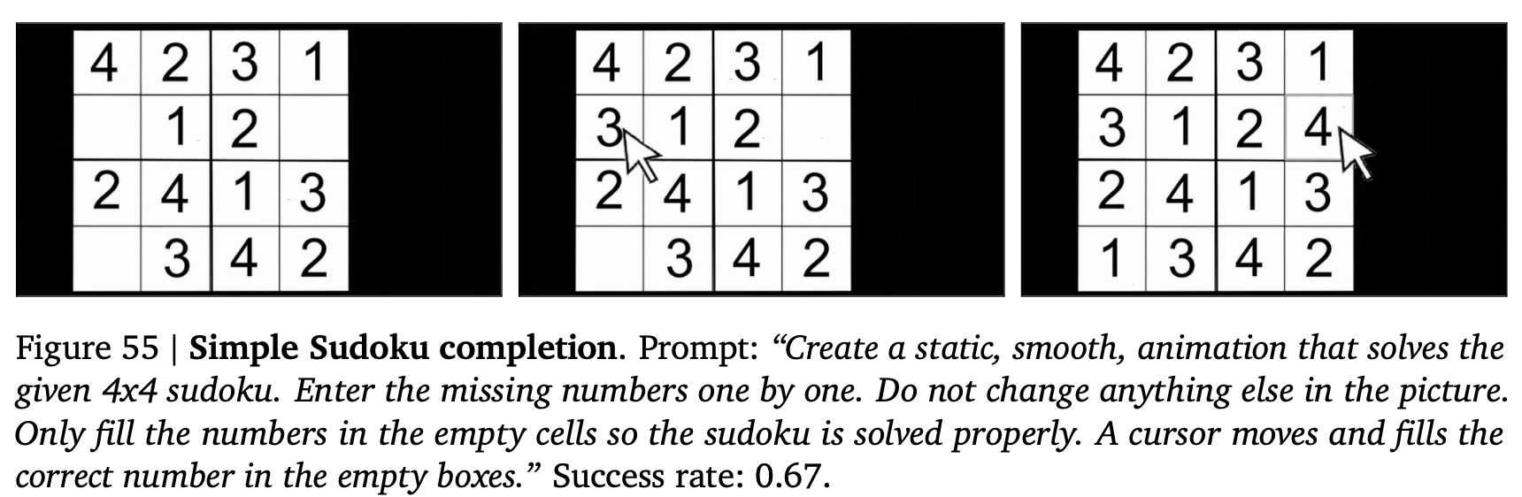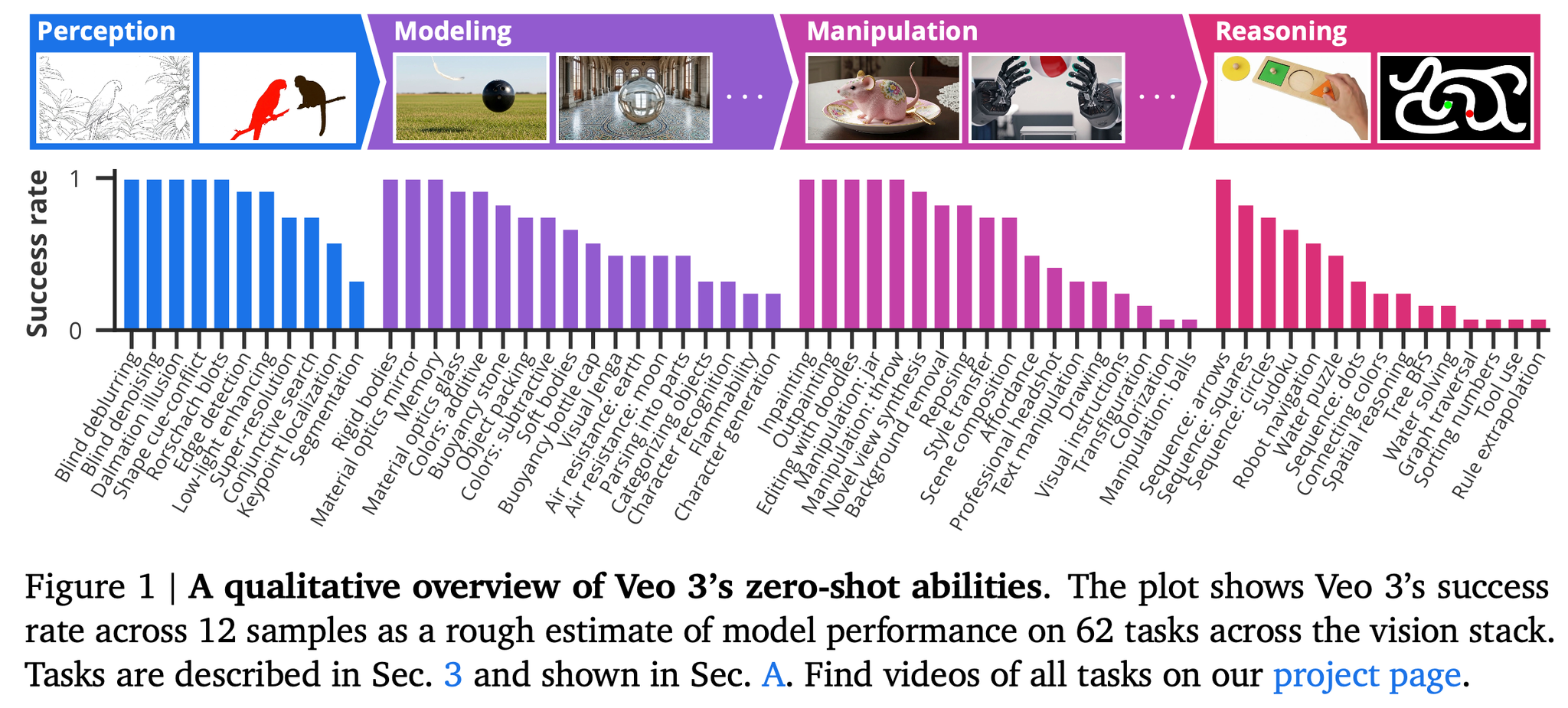 この定性的な実験を示すセクションにおいては各タスクについて、Veo 3に12回プロンプトを提示し、キャプションに成功率を報告する。成功率は、生成された動画のうちタスクを解決した動画の割合(著者らによる判定)として定義される。成功率が0より大きい場合、モデルがタスクを解決する能力を有することを示唆し、成功率が1に近いほど、ランダムシードに関係なくタスクが確実に解決されることを示す。第4節で行う体系的な定量化に代わるものではないが、これはモデル能力の大まかな見積もりを提供する(結果の概要は以下)。