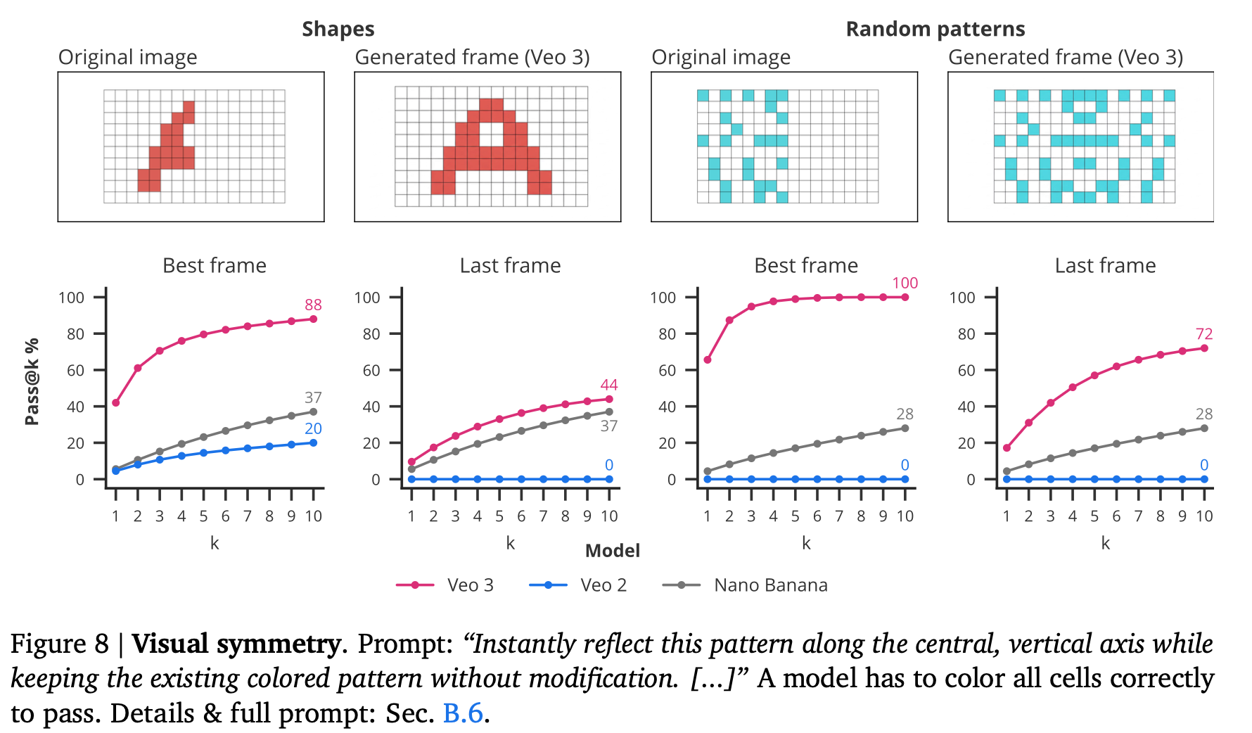 本論文の核となる主張(ビデオモデルはゼロショット学習器であり推論器である)は、十分な能力を持つ任意のモデルで成功を実証することで裏付けられる。Veoはテキストからビデオへ、および画像からビデオへのリーダーボードで常に上位にランク付けされているため、選択された。