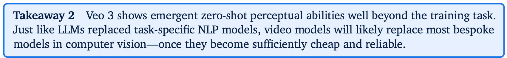 Veo 3は、訓練タスクをはるかに超えた創発的なゼロショット知覚能力を示す。LLMがタスク固有のNLPモデルを置き換えたのと同様に、ビデオモデルも、十分に安価で信頼性が高くなれば、コンピュータビジョンにおけるほとんどの特注モデルを置き換える可能性が高い。
