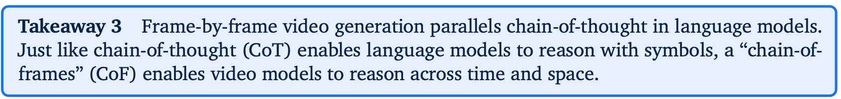 言語ドメインでは、連鎖的思考によりモデルは推論問題に取り組むことが可能になった。同様に、Chain-of-Frames(別名:ビデオ生成)は、時間と空間にわたる段階的な推論を必要とする困難な視覚問題をビデオモデルが解決することを可能にするかもしれない。