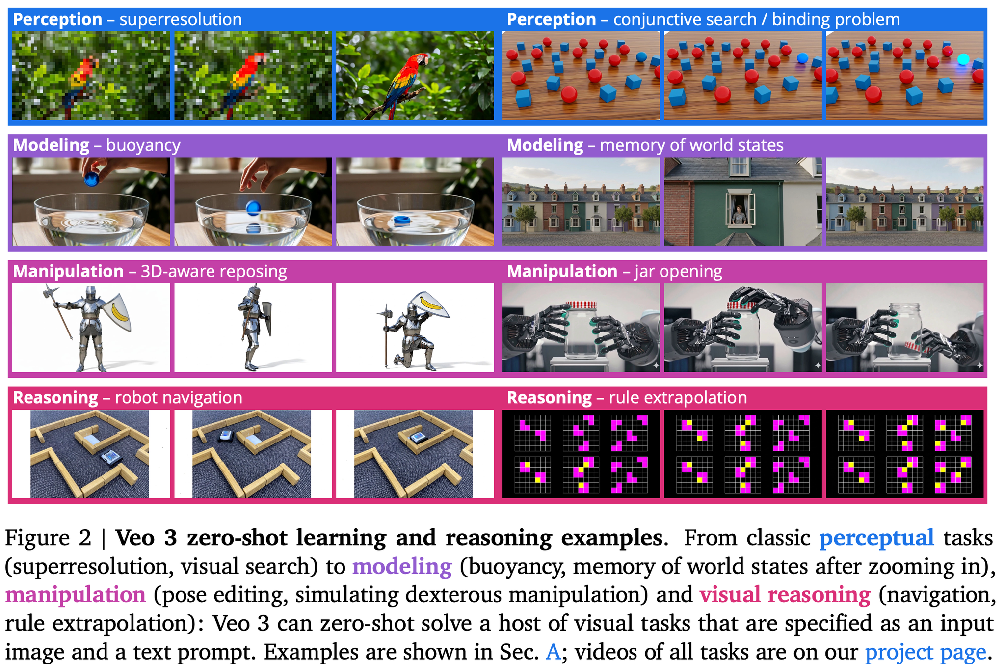 これらの能力の境界はしばしば重複するが、この階層はビデオモデルの創発的な能力を理解するための枠組みとなる。たとえば、迷路を解く際には、迷路を知覚し、その状態をモデル化(壁と床など)し、オブジェクトを操作(ネズミ)して開始から終了まで移動させる必要がある。