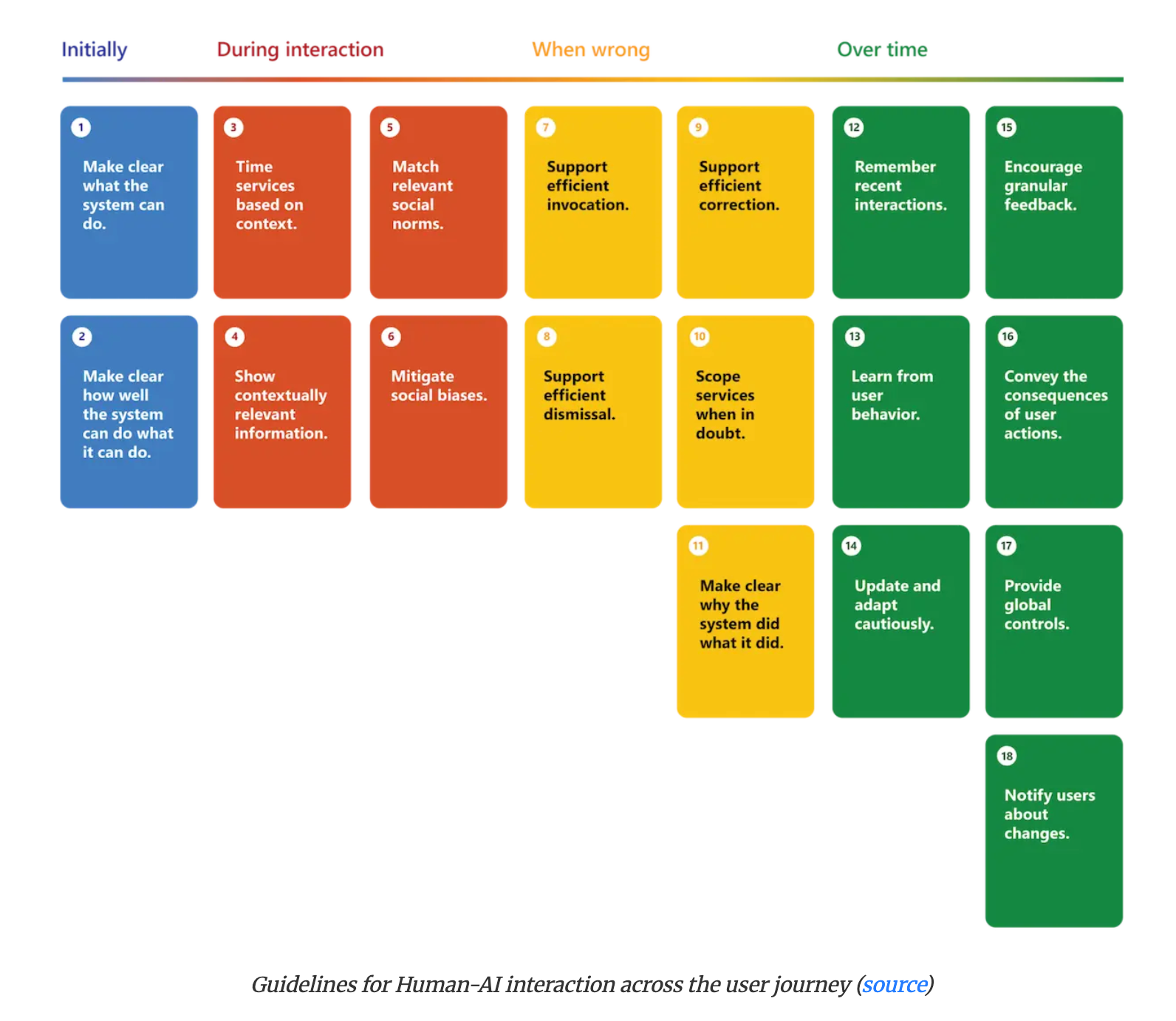 Microsoftが人間とAIのインタラクションにおける18の設計ガイドラインをまとめたもの。ユーザーがAIシステムとどのように関わるかという時間軸に基づいて、「初期段階」「インタラクション中」「誤動作時」「長期的な利用」の4つのカテゴリに分類。各ガイドラインには、ユーザーがAIシステムをより効果的かつ快適に利用するための具体的な指針が示されている。