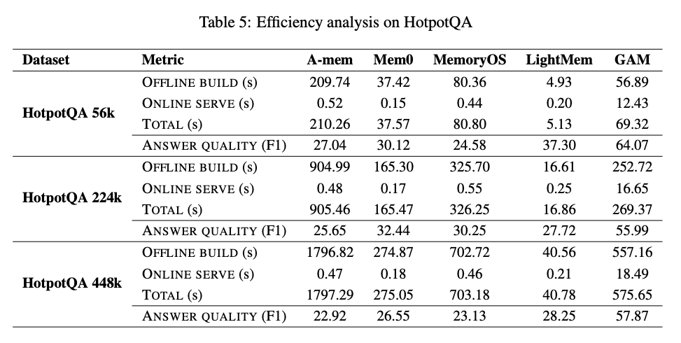 - offline build(memoryの構築)はやや時間がかかるものの、A-memやMemoryOSと同等以上程度に収まっている