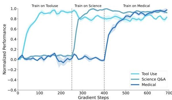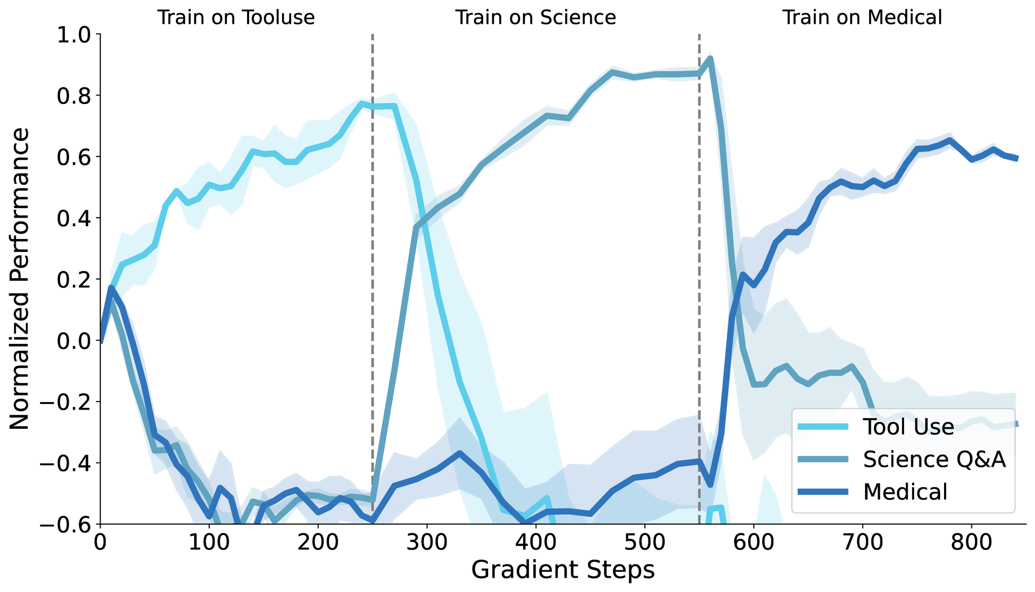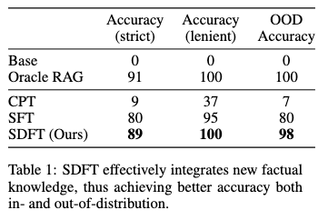 - SFT(上)はファインチューニングをするたびに精度が急激に下がるが、SDFT(下)は安定した精度を保つことができている