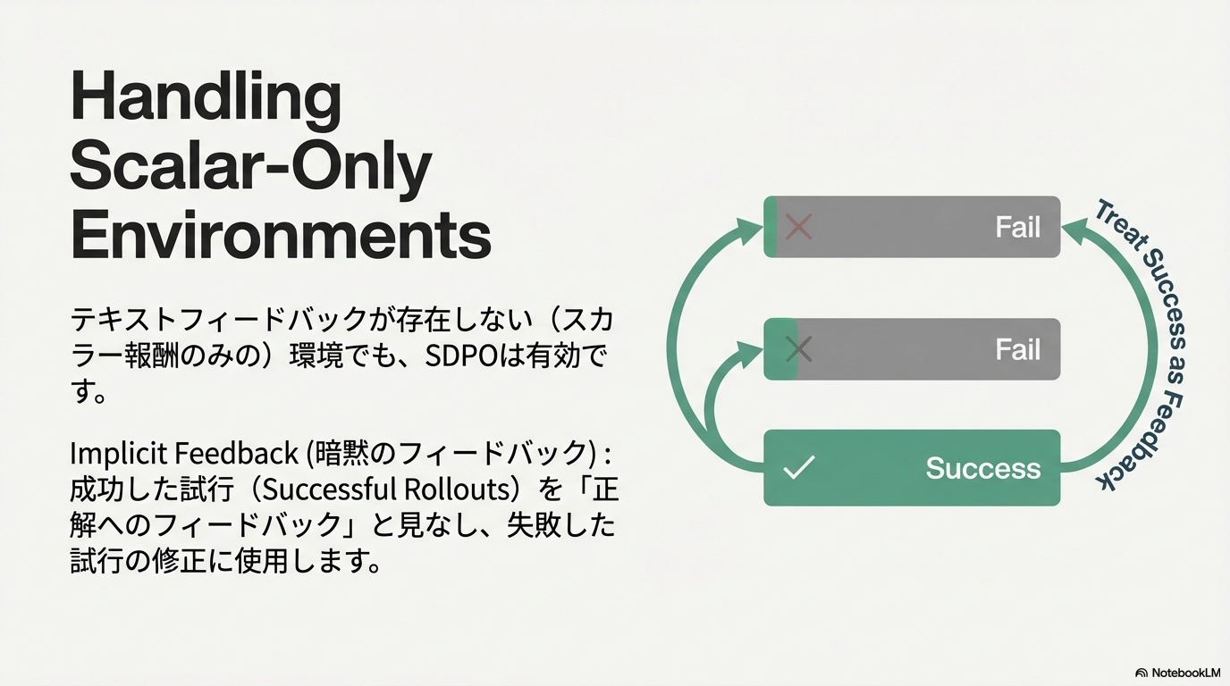 - リッチなフィードバックがない環境(標準的なRLVR)