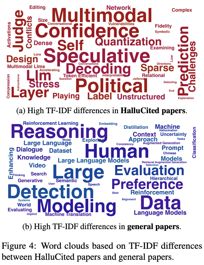 Fig.1 は "HalluCitation" の例。一番上は arXiv ID が関係ない論文のものになっていて、真ん中は引用の仕方が変(Anticipated for NeurIPS 2024)であるし arXiv ID も間違っている。一番下はそもそも論文そのものが存在しないし、電子ファイル上でのリンクは異なる実在する論文に飛ぶようになっている。