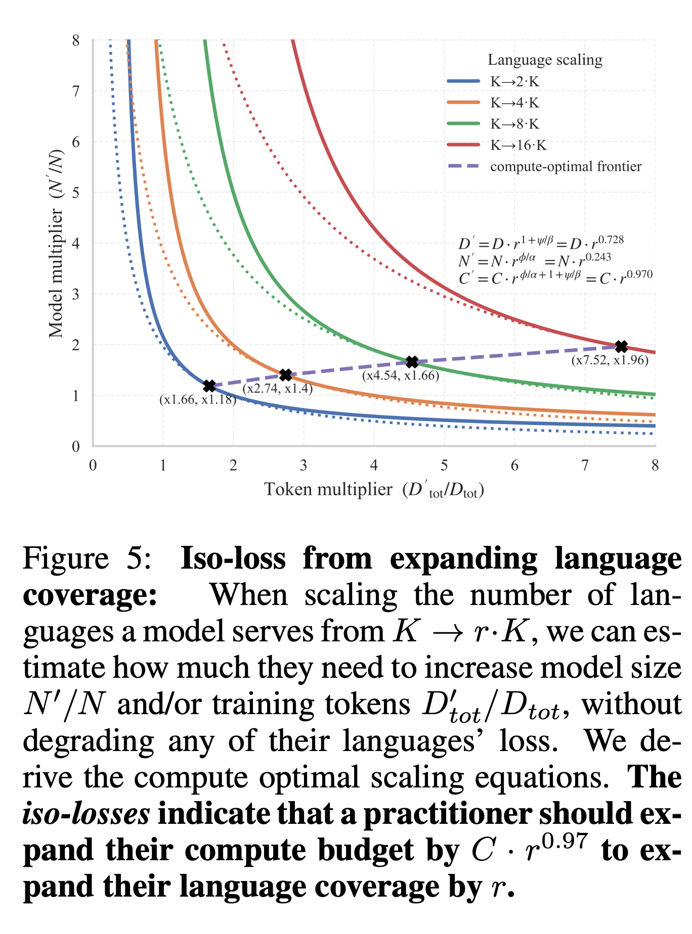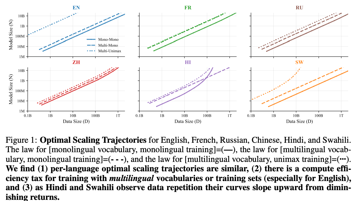 - A scaling law for the curse of multilinguality(言語に依存しないスケーリング則):新しく言語を追加する際に、性能を犠牲にすることなくモデルサイズとデータを最適にスケーリングする方法を導出