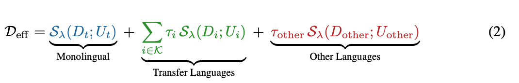多言語モデルでは「スペイン語の学習がポルトガル語の性能を上げる」といった転移(Transfer)が起きるはず。しかし、既存の法則はすべてのデータをひとまとめにするか、ターゲット言語しか見ないため、「どの言語がどれくらいターゲット言語の役に立ったか」をうまくモデリングできていない。