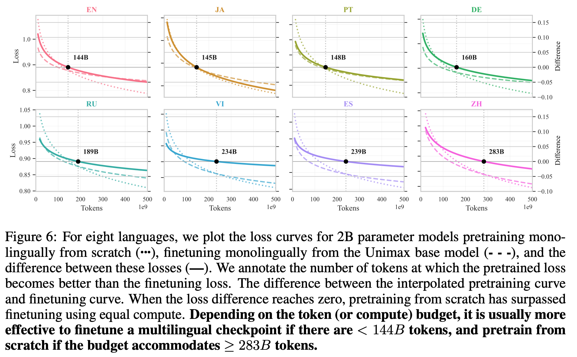 言語によってぶれるが、144B-283Bトークンの間にクロスオーバーポイントは存在するので、このデータ量を目安にして、ゼロからの事前学習を行うのか、finetuningにするのか決めれば良いであろう。